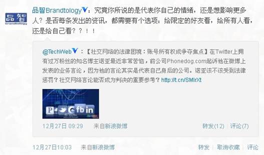也听到一些企业老总对于自己及员工上微博表示担忧。微博中你说话代表了谁?仅仅代表你自己还是会引起关注的你身后的那个企业?企业怎么应对这种复杂的情况?当一个人是你的员工,同时又是个媒体发声人时,你准备好了吗?