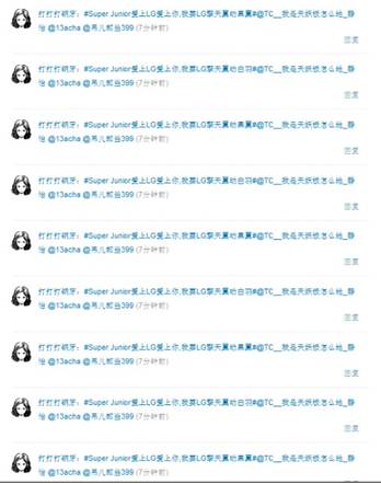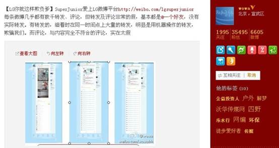 “昨天下午,沃华传媒网创始人、总编辑黄华(@wowa)微博以‘LG你就这样欺负爹”揭露LG官方微博(@SuperJunior爱上LG微博平台)存在大量造假问题,机器人操作,欺骗网民。’”(如图4)
