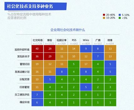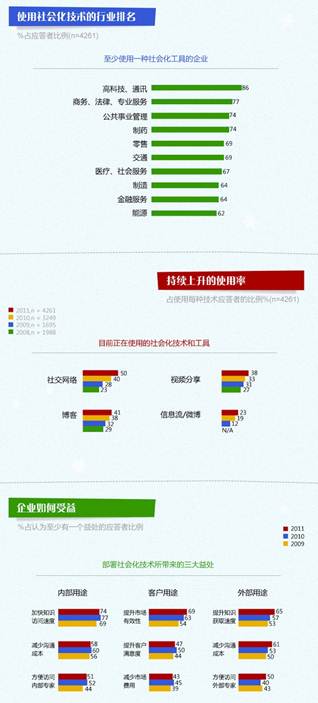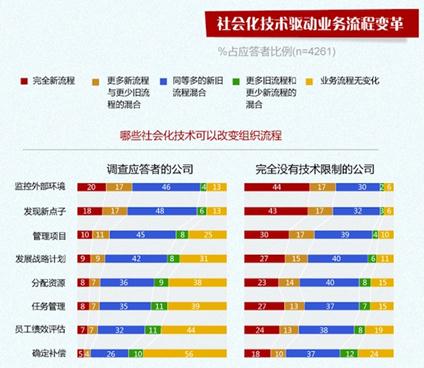 2011年11月,麦肯锡就社会化技术及工具在企业运营及拓展新的市场机会等方面的应用,对4200个跨部门跨地域的企业高管进行了第五年的调研。调研结果显示社会化媒体新技术及工具正在改变企业与员工、客户、供应链及合作伙伴的管理方式,及企业的运营流程。