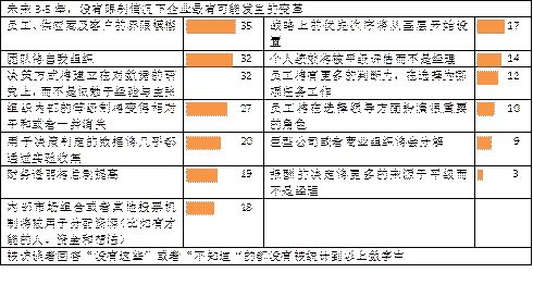 很多企业把社交技术用于研究外部环境中的新想法,而不同的企业适用于不同的社交技术工具;更多的企业认为社交技术会驱动企业业务流程变革(如图5-4,5-5)。并随着企业对社交技术在企业中应用约束的减少,员工、供应商和客户的界限会越来越模糊,更多的员工团队能够进行自我组织;基于数据驱动的决策将会越来越重要(如图5-6)。